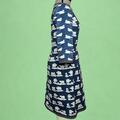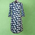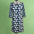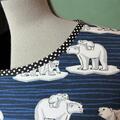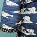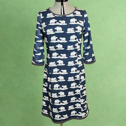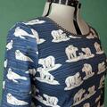 Her Kjolen syet i bomuldsjersey med print af isbjørne på blå bund, og ærmer med sæler på. Kantet med prikkede bånd.