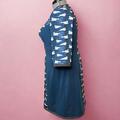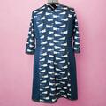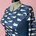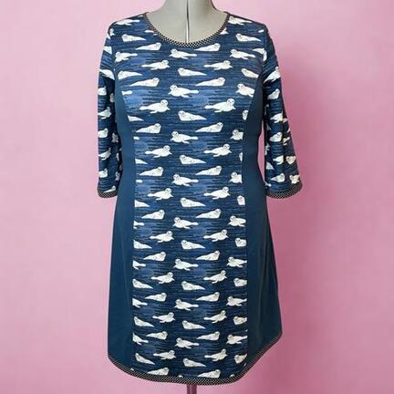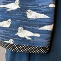 Her Kjolen syet i bomuldsjersey med print af sæler, og sider i ensfarvet blå.