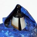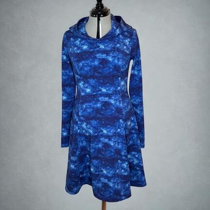 Her er Birgitte kjolen syet i det vild fede batik print i blånuancer. Kjolen har fået ekstra lang hætte og lommer i siden.