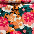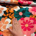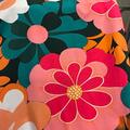 Store retroblomster i pink, petrol og orange.
