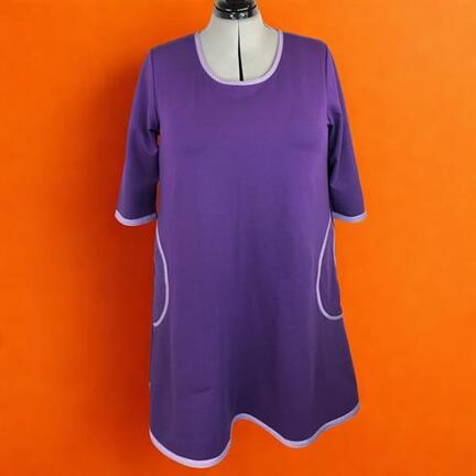 Få syet en lækker og klassisk ensfarvet kjole i french terry. Det er en lidt jerseykvalitet som egner sig super godt til ensfarvede kjoler, da tykkelsen på stoffet er bedre til et skjule diverse folder, deller og hvad vi ellers har på vores skønne kroppe.