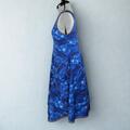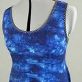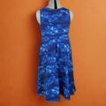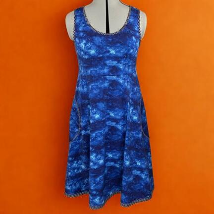 Model LInea swing her syet i blåt batik print. Uden ærmer og med lommer