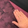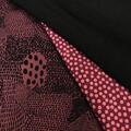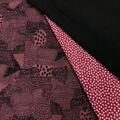 Unika pakke med sort grafisk print på mørkrød bund, sat sammen med matchende prikker og ensfarvet sort.