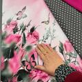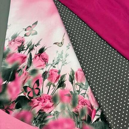 Unika pakke med skønne roser og sommer fugle, sat sammen med ensfarvet pink og prå med prikker